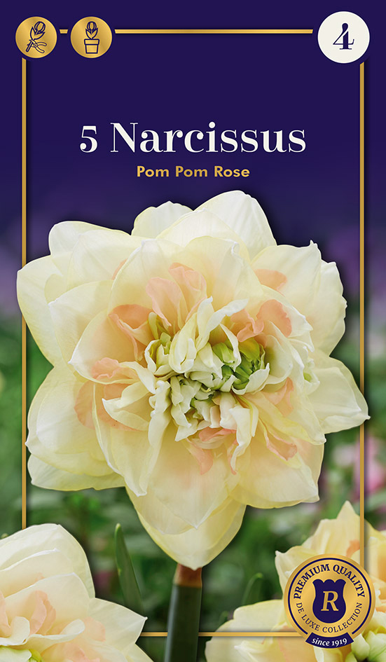 Pom pom rose, er en flerdobbelt påskelilje med fine nuancer af rosa omkring midten. Meget velegnet til buketter.